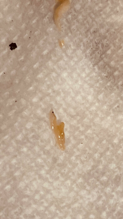 The organism has no discernible head, appendages, segmentation, markings, orifices, or other features. On top of that, Clifton does state that the creature was essentially boiled alive, which definitely could have changed, if not mangled, its features. It is also possible –and we apologize for the imagery– that these are bits of a larger organism that fell off when it got boiled. Alternatively, these are not organisms at all, but just organic debris in the pipes that have come up through the faucet. In any case, we will not be able to provide an identification of this creature. On top of that, Clifton mentions the possibility, or theory, that these could be tapeworm larvae. He does not mention if he has other cause to believe, like if he were experiencing symptoms of some kind, but in any case, we are not able to identify tapeworms because they are parasites.